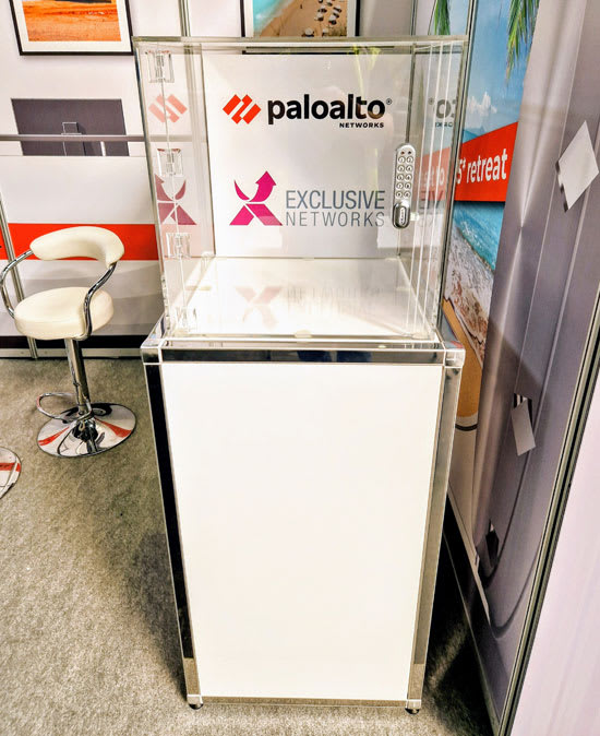 The Safe Cracker game is supplied on a smart chrome framed plinth with the option of your bespoke branding being applied to the plinth body panels. How many sides of the plinth are branded is down to you. Some people go with just the front, some go with all four panels - it normally depends on how many sides are visible to stand visitors depending on it's position on the stand and the stands layout.
