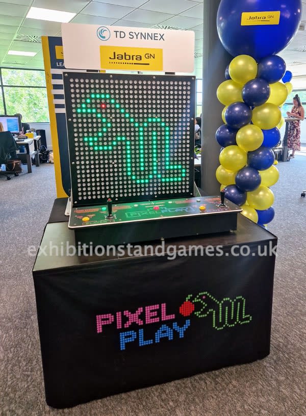 Pixel Play gives you the choice of four different retro style games all played on the large display screen made of up of nearly 700 RGB pixels. The game can be placed on your exhibition stand counter or we can supply it on a purpose made plinth with wrap around skirt - we offer the additional option of having the skirt branded. The four retro games are: Pixel Paddles - pretty much identical to one of the very first arcade games Pong. Pixel Python - just like playing a giant version of Snake on your good old Nokia! Pixel Pieces - arrange the dropping shapes as quickly as you can just like Tetris. Pixel Paint - Create Pixel Paint artwork master pieces! The game can be played head to head by two players or by just one player. We offer free delivery to exhibitions being held at the NEC Birmingham, The ICC Birmingham, Telford International Centre, and Stoneleigh all of which are local to us. For a quote to hire our Pixel Play game for your exhibition stand CONTACT US with details of your event requirements.