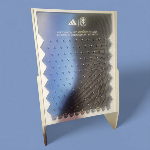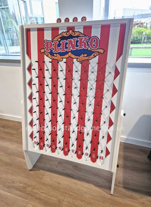 Our giant sized Plinko game is a recent addition to our range of exhibition stand games. Standing at 1.5m tall our Plinko game is available with one of our two standard, neutral, game backgrounds or you have the option of adding a custom background with your own personalised branding like the example we supplied below.