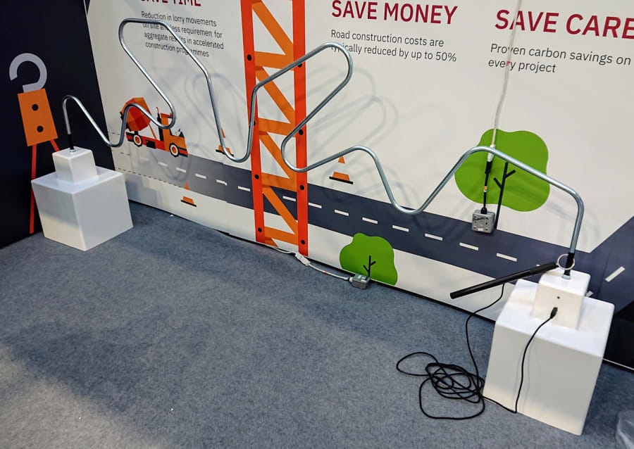 Our Mega Beat the Beep game is a floorstanding wonky buzz bar game measuring approx 2.7m in length where participants attempt to manoeuvre the ringed wand along the bending bar from one end to the other without touching the bar and making it beep or making it beep as few times as possible.