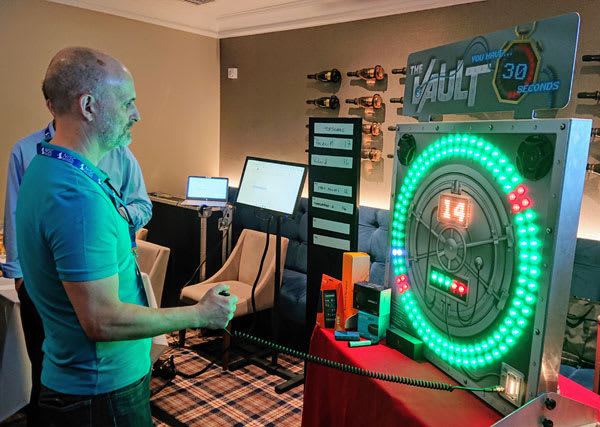 The participant has 30 seconds to 'open the vault' but to do so they must stop the circling white light in the red sectors five times by pressing the handheld trigger button at the right time. This sounds easy enough but as they progress through those five rounds of the game the red sectors get fewer and smaller.